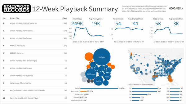 Mood Media distributes thousands of and produces millions of plays across their brand estate every day. With the modernization of the technology stack, it is now possible to synthesize asset data across that estate and gather insights into asset/brand placement over time, geo-location, and customer segment. This capability enables Music Labels to see in real time how their content is trending across Mood's estate, identify opportunities for cross-promotion and placement.